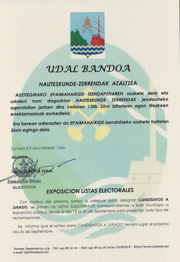 Con motivo del próximo sorteo a celebrar para designar CANDIDATOS A JURADO, se ponen las LISTAS ELECTORALES correspondientes a este municipio a exposición pública desde el día 13 al 20 de septiembre para presentar todo tipo de reclamaciones.