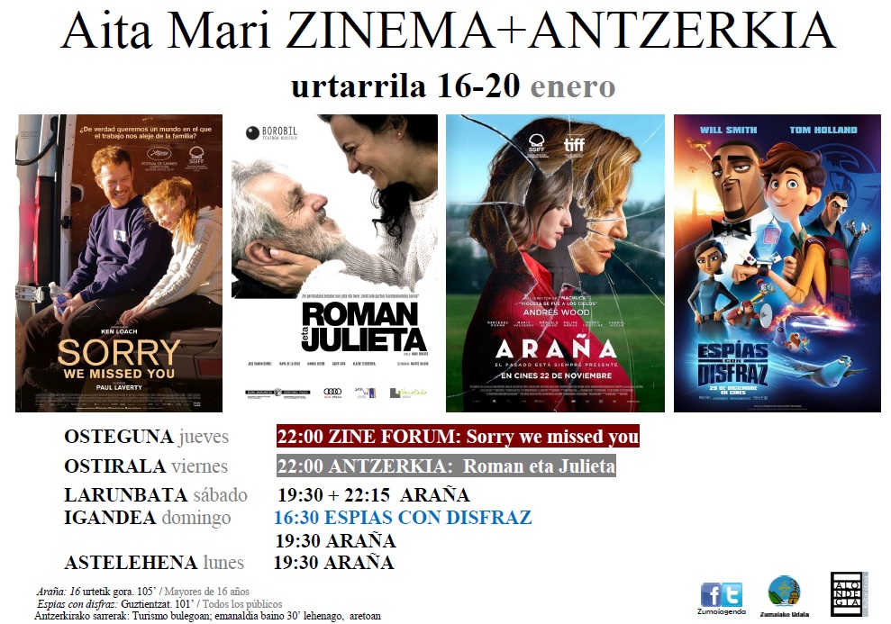Cartelera y teatro:"Sorry we missed you" + "Roman eta Julieta" + "Araña"+"Espias con disfraz"