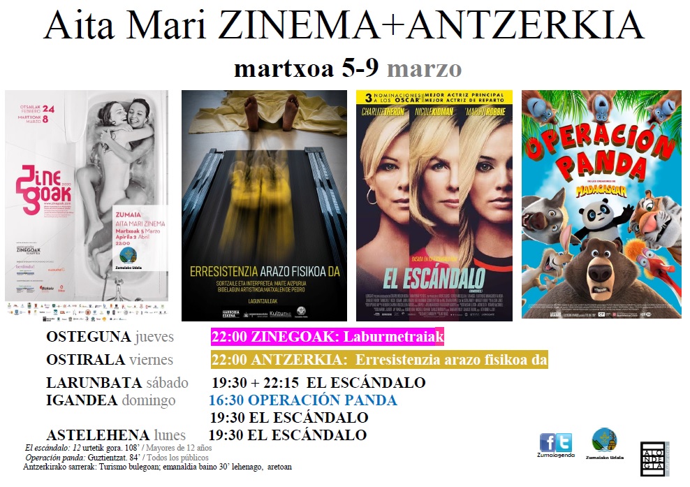 Cartelera y teatro:"Zinegoak" + "Erresistenzia arazo fisikoa da" + "El escándalo" + "Operación panda"