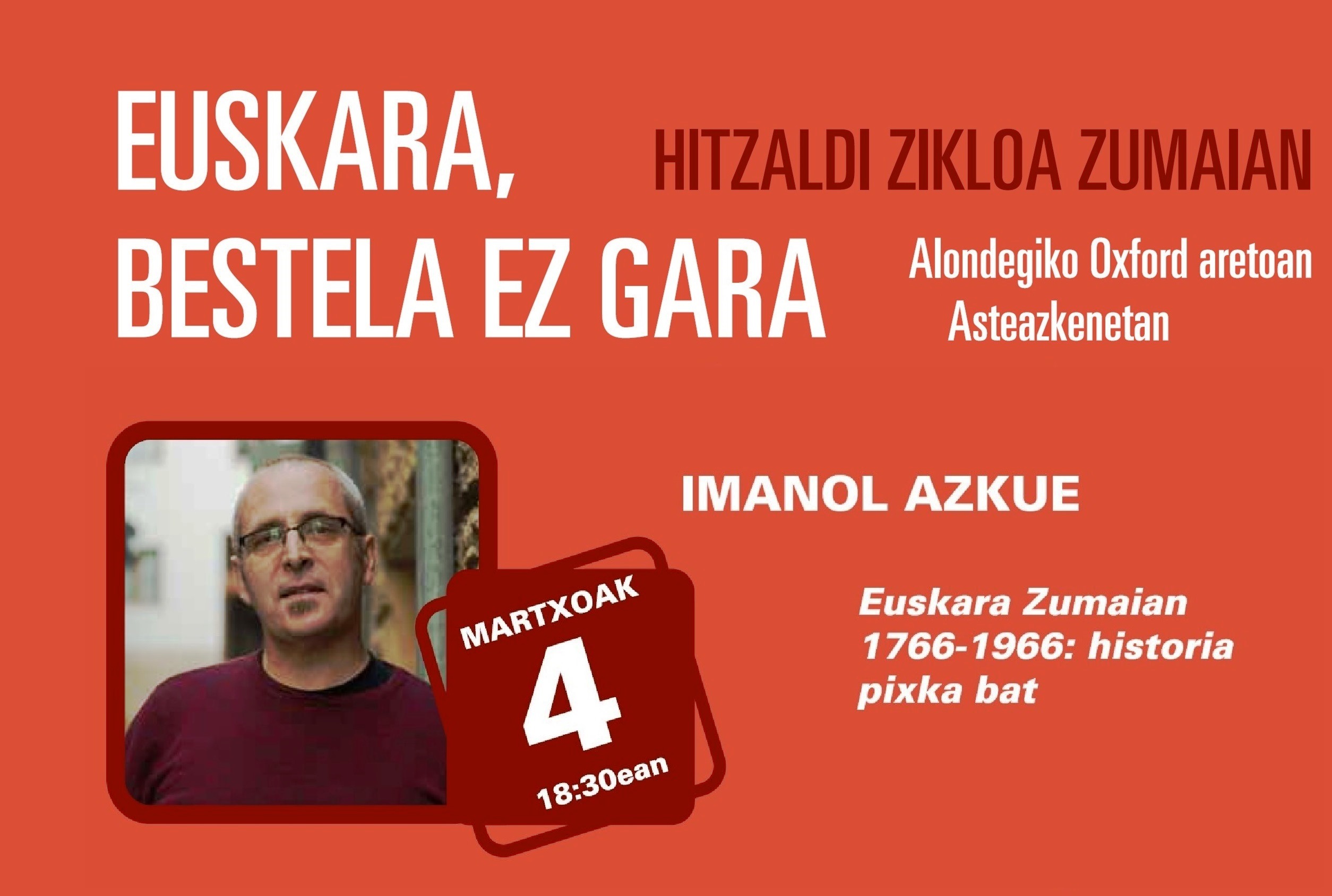 - 4 de marzo: Euskara Zumaian 1766-1966: historia pixka bat, istorio batzuk, Imanol Azkue