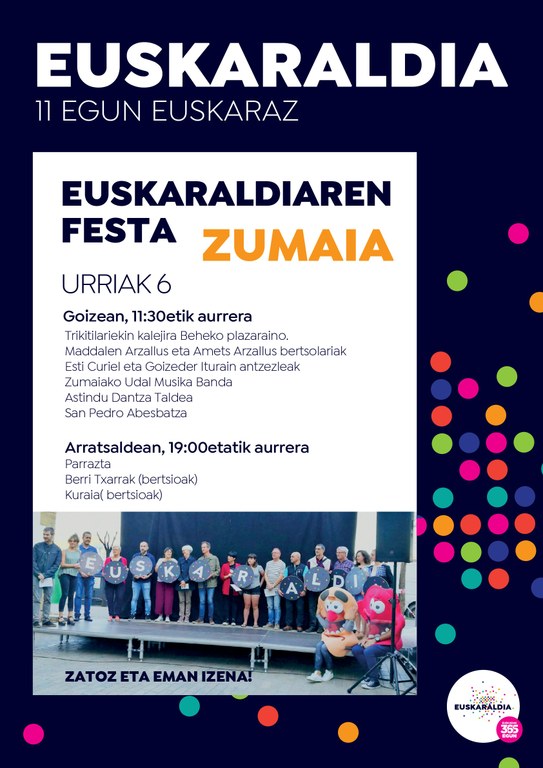 Habrá puntos en los que obtener información e inscribirse, en un ambiente festivo al que se han sumado numerosas asociaciones y artistas de Zumaia: trikitilaris, bertsolaris, actuaciones de la Banda de Música de Zumaia, la coral San Pedro, el grupo de danza Astindu, conciertos…