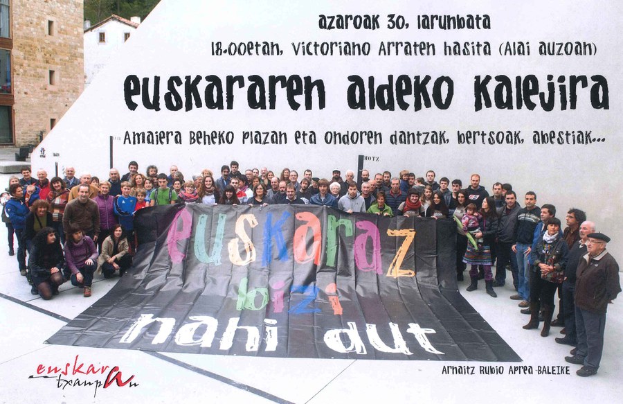 Geroa euskaraz eraikitzeko, ordea, garrantzitsua da zertan ginen jabetu eta egun zein egoera daukagun ikustea. Eta, gaur egun daukagun egoerari erreparatzen badiogu, zonaldearen arabera, oso egoera soziolinguistiko ezberdin eta kontrajarriak dauzkagula ohartuko gara. Oraindik ere, arrotz dabil euskara bere herriko hainbat eremutan, aitortza ofizialik gabe eta lege babesik gabe. Aldiz, nagusi da gure herriko beste hainbat eremutan.