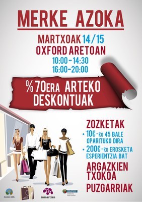 Datorren larunbat eta igandean Merke Azoka izango da Alondegiko Oxford aretoan Zumartian elkarteak Udalarekin elkarlanean antolatuta. Piratetxea, Arruti, Ipotxak, Oskarbi, Spot, Gofi, Flysch, Kulunk, Marisa Oinetakoak dendek hartuko dute parte eta %70 arteko deskontuak izango dira. Azokan bertan gastatzeko 10 euroko 45 erosketa txartel eta 200 euroko erosketa esperientzia bat ere zozkatuko dituzte, besteak beste. Azoka larunbata eta igandean, 10:00etatik 14:30era eta 16:00etatik 20:00etara izango da irekita.