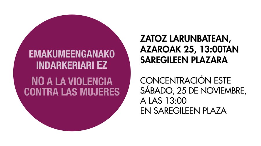 Azaroaren 25ean, indarkeria matxistaren aurkako Nazioarteko Eguna da eta horren harira, ekintza ugari antolatu dituzte Udalak eta Berdintasun Foroak elkarlanean. Horien artean, elkarretaratzea deitu du larunbatean, 13:00etan Saregileen plazan. Zatoz eta esaiozu EZ indarkeria matxistari!