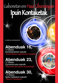 Biharkoan, Kontukaitoren txanda izango da eta ‘Gabonetan eguberriak ospatzen’ ipuina kontatuko dute. Bigarren saioa abenduaren 23an izango da eta ‘Mamuak eta auzokideak’ ipuina eskainiko du Zurrumurru taldeak. Azkenik, abenduaren 30ean Apika taldeak kontatuko du ‘Album familiarra’ izeneko ipuina.