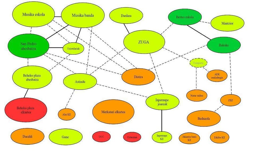 Taldeek euskal kulturarekin eta sorkuntzarekin duten lotura irudikatzeko, mapa moduko bat proposatu du Azkuek. Koloreek ez dute adierazten taldeak euskararekiko duen jarrera edo erabilera, baizik eta euskal kulturaren transmisioan daukan eragina: berdez euskaraz sortzen duten taldeak, eta gorriz euskal kultura eskaintzen ez dutenak. Tamaina batzuk bereizi dira, kide aktiboen kopuruaren arabera; marrek, berriz, taldeen artean dauden harremanak adierazten dituzte, noizbehinkakoak (etenak) eta estuak (jarraituak) bereizita.