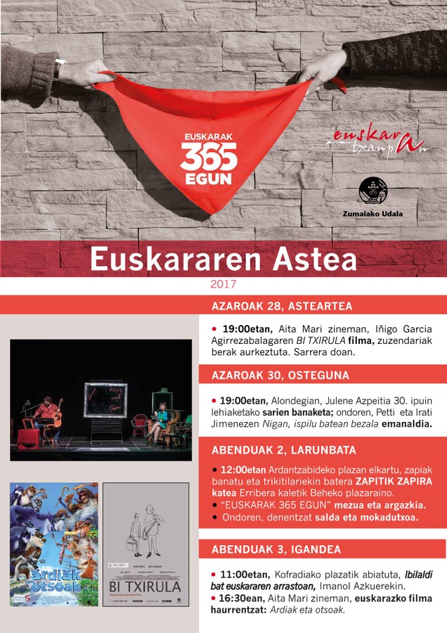 Igandean, Euskararen Egunean, Ibilaldi bat euskararen arrastoan hitzaldi ibiltaria abiatuko da, goizeko 11:00etan, Kofradiako plazatik, Imanol Azkueren gidaritzapean. Bidean zehar, euskarak herrian izan duen bilakaeraren inguruan mintzatuko da. Izan ere, euskara ezkutatuta egon zen hainbat urtetan, baina 1960tik aurrera lekuak eta funtzioak irabazten hasi zen, zumaiarren eta herriko taldeen ekimenez (ikastola, udala, euskaltegia, bertso eskola...) eta ibilaldian horietako batzuk kokatu eta ezagutzeko aukera izango da. Arratsaldean, aldiz, ekintza egitaraua ixteko, Ardiak eta otsoak euskarazko filma eskainiko da haurrentzat, 16:30ean Aita Marin.