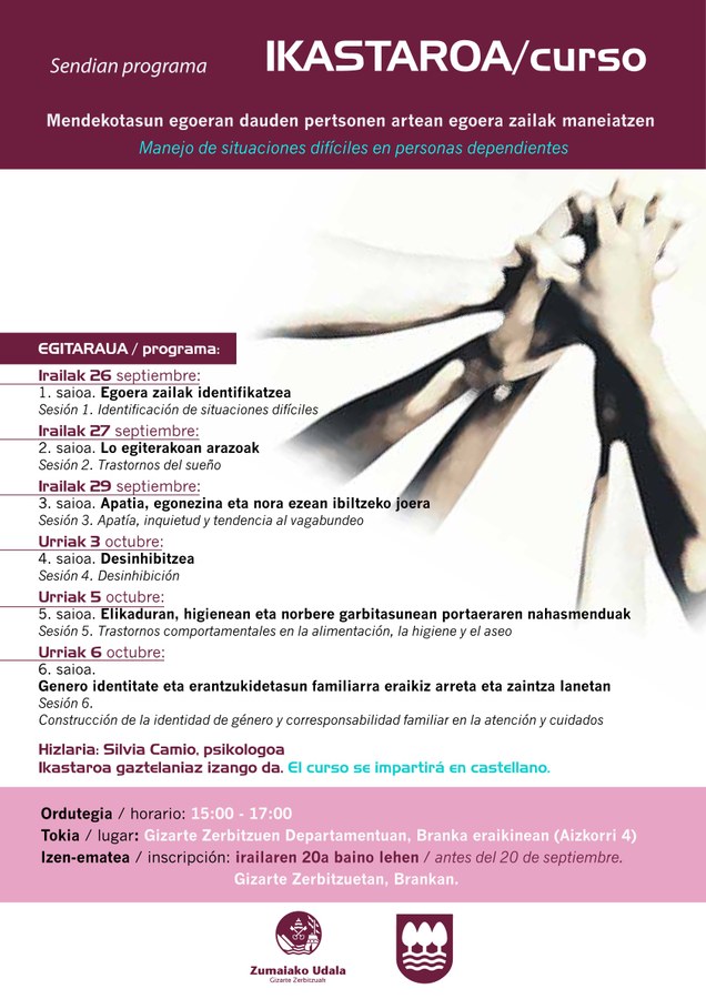 Sendian programaren baitan, Zumaiako Udalak, Foru Aldundiarekin elkarlanean, familia ingurunean mendekotasun egoeran dauden pertsonak zaintzeaz arduratzen diren senide zaintzaileei zuzendutako ikastaroak antolatu ditu iraila eta urria bitartean.