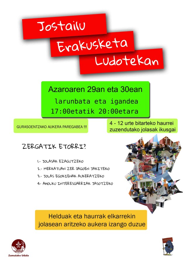 Bertan erosketa arduratsua bultzatzeaz gain jolaserako gunea sortu nahi da. Haurrak gurasoen laguntzaz erakusketa bisitatzeko aukera izango dute, baina ez da ludoteka zerbitzurik izango. Azaroaren 29an eta 30ean 17:00-20:00 ludotekan izango da erakuketa irekita.