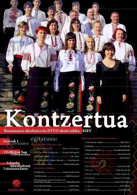 Kiev-eko (Ukraina) Reinassance abesbatzak kontzertua eskainiko du asteburu luze honetan Zumaian. Azaroaren 1ean izango da emanaldia, Zumaiako San Pedro parrokian eta 19:00etan hasiko da. Tolosako Abesbatza Topaketen barne kontzertu gisa eskainiko dute Zumaiako emanaldia.