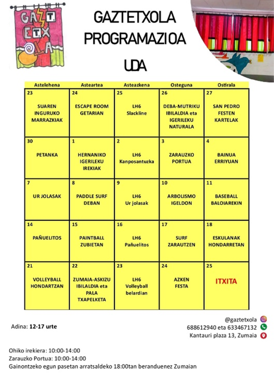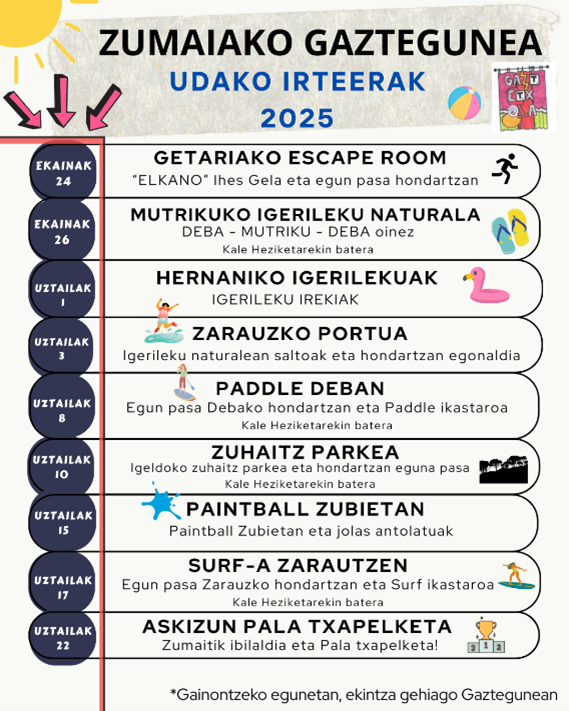 Uda honetarako ere nerabeeri zuzendutako egitarau erakargarri eta zabala prestatu dute. Txangoetara joateko izena emateko azken eguna ekainaren 9a (astelehena) izango da.