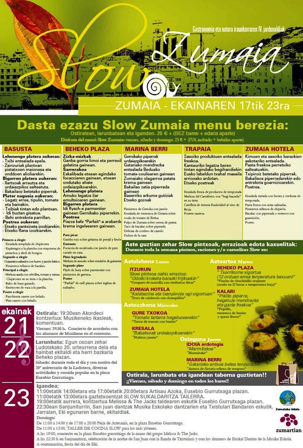 Aste honetan, Slow Zumaia ekimena abian da herrian. Astean, ekimen honetarako bereziko prestatutako pintxo, errazio eta kaxuelita bereziak izango dira hainbat taberna eta jatetxetan. Asteburua gerturatzearekin bat, ostiraletik igandera bitartean menu berezien eta kultur ekitaldi desberdinen garaia izango da.