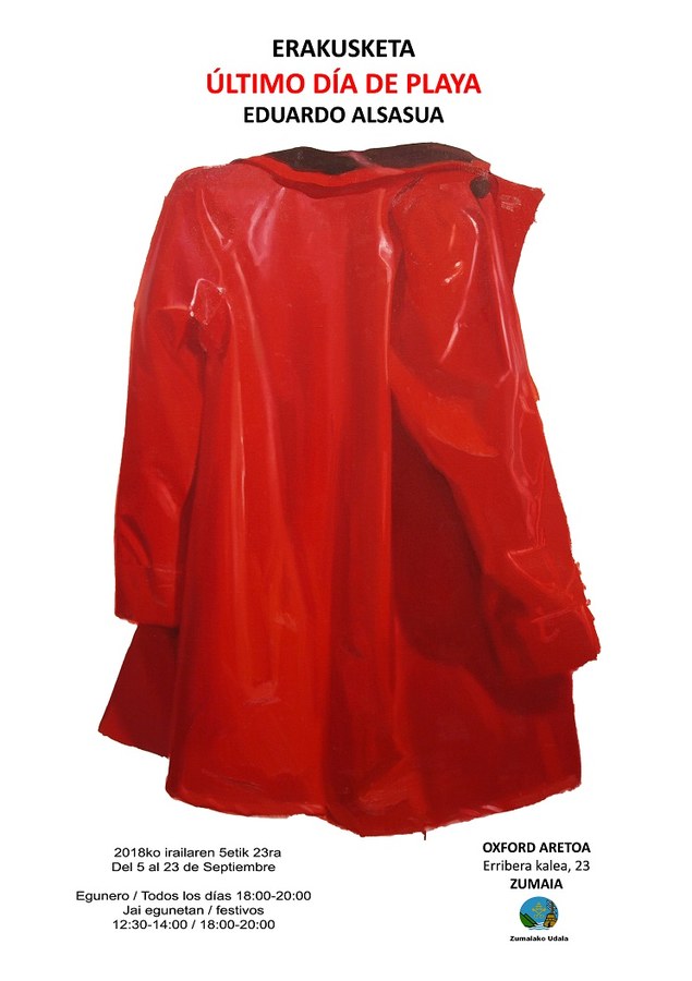 Último día de Playa, Eduardo Alsasuaren azken lanak biltzen dituen erakusketa, Zumaiako Oxford Aretoan egongo da irailak 5-23 bitartean. Margolaritza errealista garaikidea egiten du Alsasuak, bizi duen errealitate hurbila oinarri hartuta. Paisaiarekin du zerikusia mundu horrek; hiriaren aldirietan gertatzen denarekin; ‘naturarekin’ eta gutako edonork naturan egiten ditugun jarduerekin. Lan hauek barne-barneko kontuak biltzen dituzte, etxe barrukoak: bizirautea, herabetasuna, inkomunikazioa… horietxek egunerokotik abiatuta azaleratzen direnak.