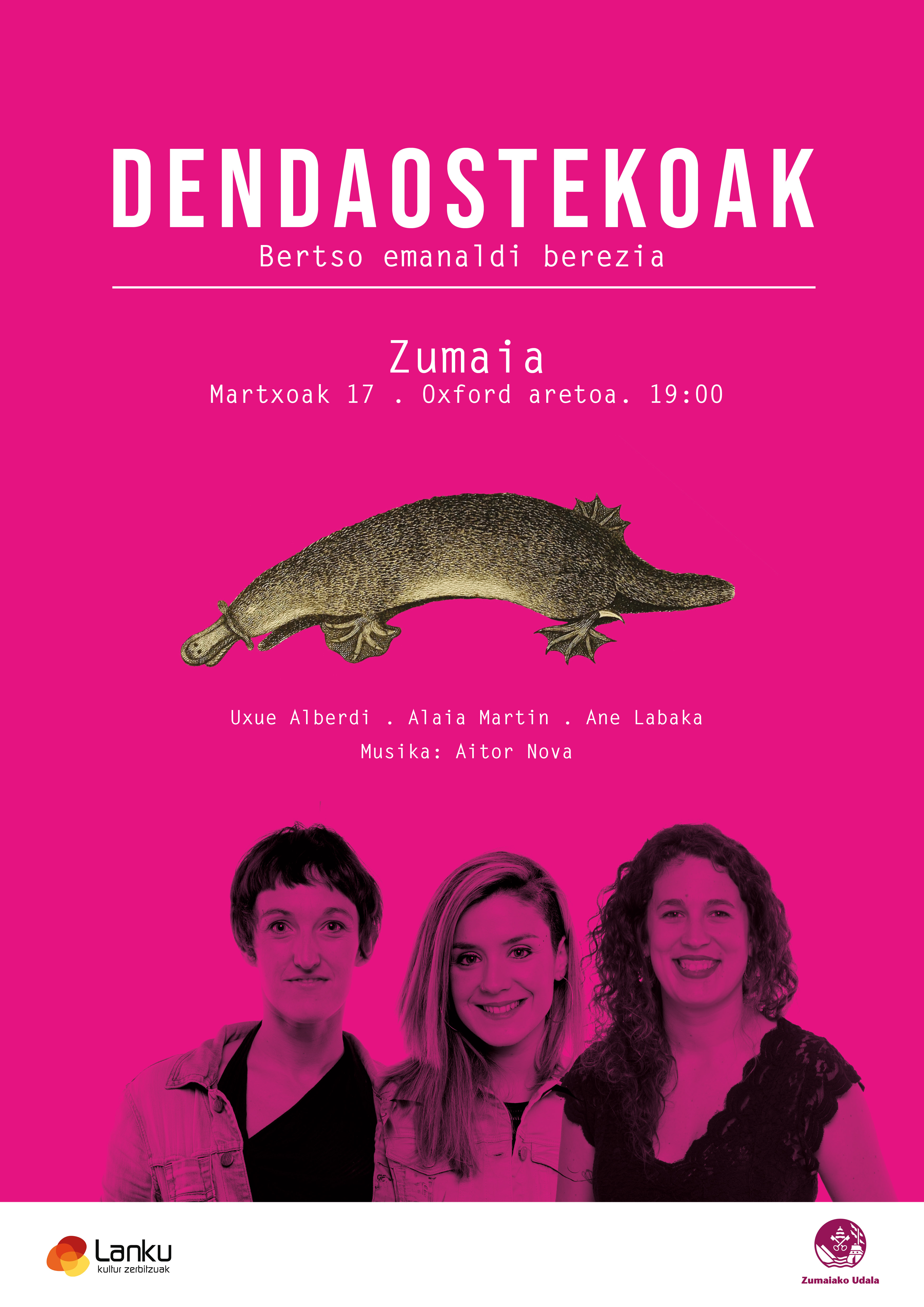 Uxue Alberdiren Dendaostekoak liburuaren pasarteei soinu-banda sortu die Aitor Nova musikari elgoibartarrak. Saxofoia, organoa, ahotsa, aurrez garbaturiko josteko makinen hotsak eta looperra erabiltzen ditu giro inguratzaile-iradokitzailea sortzeko. Emanaldi honetan liburuko hainbat pasarte irakurtzen ditu Uxue Alberdik musikaz jantzita eta haietan oinarrituriko gaiak proposatzen dizkie ondoren bertsolariei, bat-batean aritu daitezen.