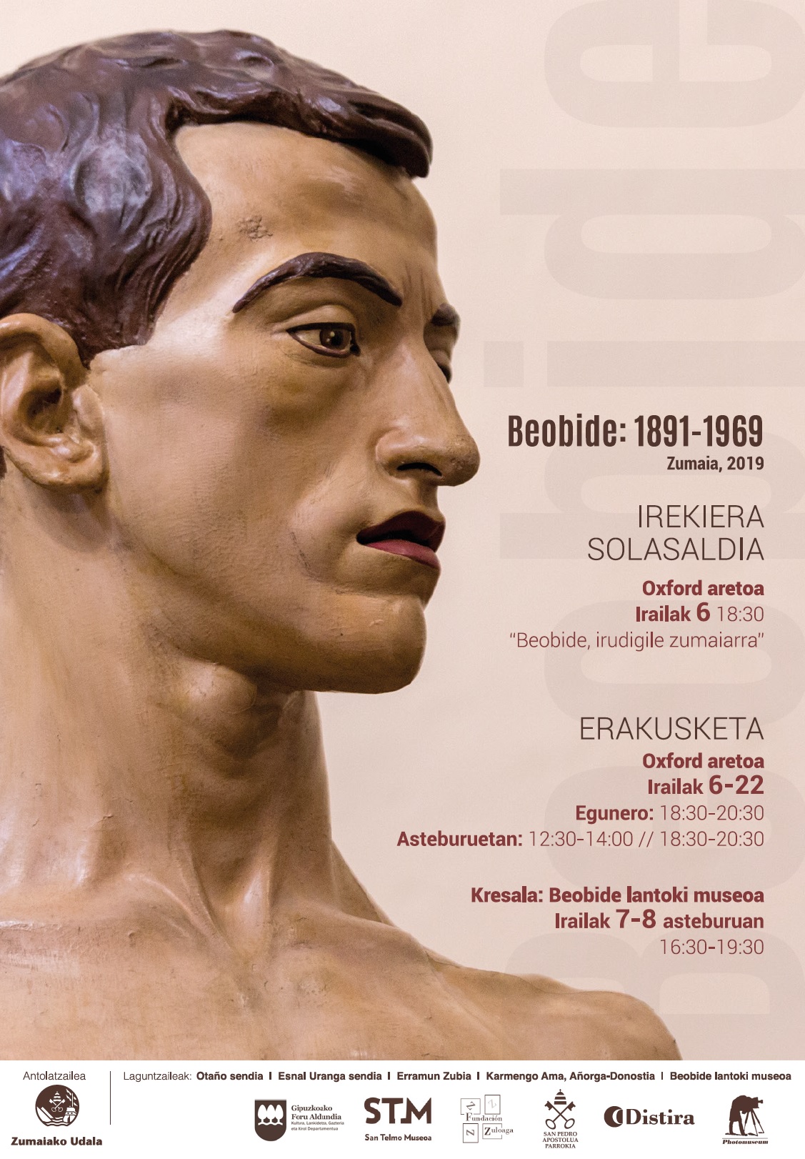 Erakusketa hainbat eragileren, herritarren eta Beobide sendiaren arteko elkarlanaren emaitza da: Otaño sendia, Esnal Uranga sendia, Erramun Zubia, Karmengo Ama Beobide lantoki museoa, Photomuseum, San Telmo Museoa, Zuloaga Fundazioa, Distira Elkartea, San Pedro Parrokia eta Gipuzkoako Foru Aldundiaren laguntza izan du Zumaiako Udalak Beobideren obra bildu eta ikusgai jartzeko.