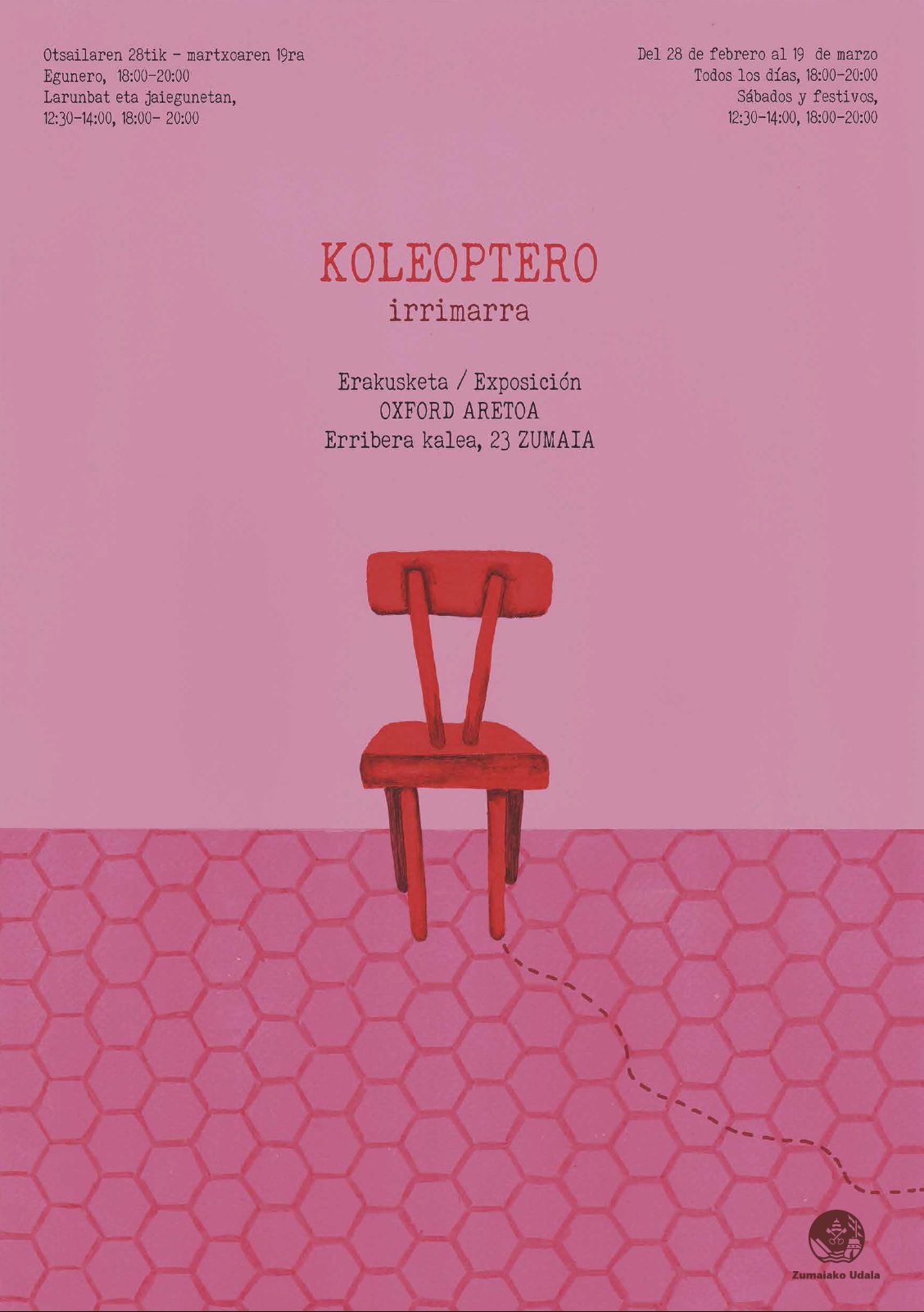 Otsailak 28tik martxoaren 19ra “Irrimarra”-ren margoak egongo dira ikusgai, Koleoptero izenburupean. Bilduma honetan, emakumea*ren irudian murgiltzen dira, gehienbat erretratuetan. Hausnarketa momentu bat islatzen da.