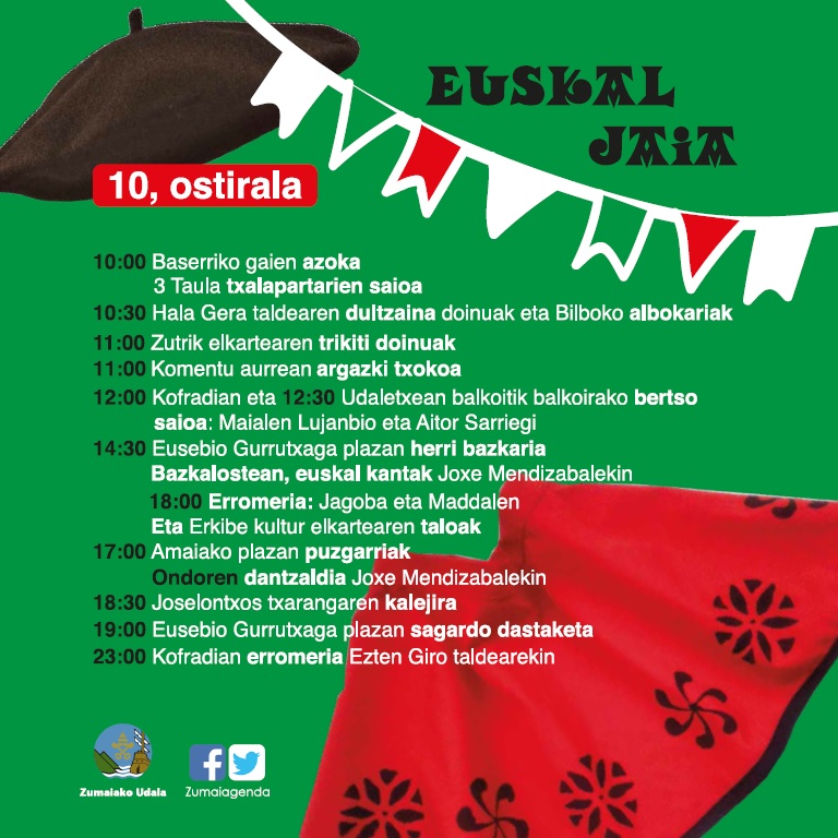14:30 Eusebio Gurrutxaga plazan herri bazkaria (txartelak Turismo Bulegoan, 8€ helduak eta 4€ 12 urte arteko haurrak)